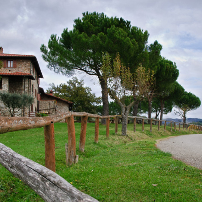 Nehmen Sie die Autobahn A 1 und verlassen Sie in Firenze Sud die Autobahn, um dann der SS 70 Richtung Pontassieve zu fahren (Richtung Consuma-Pass). Fahren Sie dann erst Richtung Poppi und dann Richtung Bibbiena. In Bibbiena fahren Sie auf der SS 208 Richtung Krankenhaus (ospedale), nach 7 km finden Sie in einer großen Linkskurve auf der linken Seite unser großes Eingangstor.
